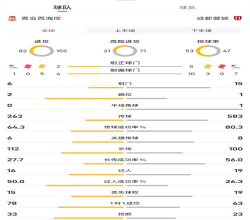 青岛西海岸vs成都蓉城全场数据:
