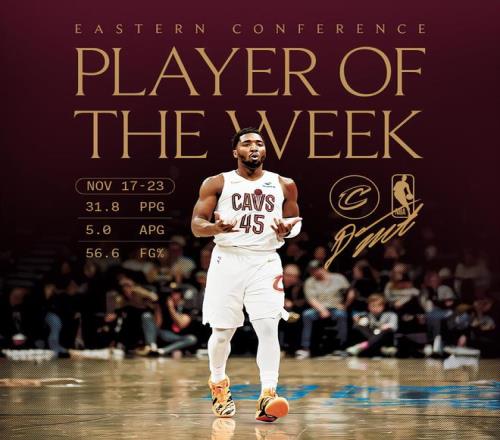 过去一周,米切尔率队取得3胜1负的战绩,他场均贡献31.8分6.3篮板5助攻,投篮命中率56.6%。