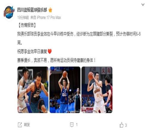 如今四川男篮官方公告写道:“我俱乐部球员李金效在今早训练中受伤,经诊断为左跟腱部分撕裂,预计伤停时间6-8周。祝愿李金效早日康复,赛季漫长,奔波不易,愿所有运动员保持健康的身体!”