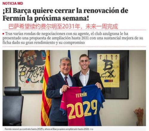 巴萨希望费尔明续约至2031年,成为全队合同年限最长的球员之一(霍安-加西亚、亚马尔、埃里克-加西亚、阿劳霍均是2031年),这体现俱乐部对费尔明的重视。