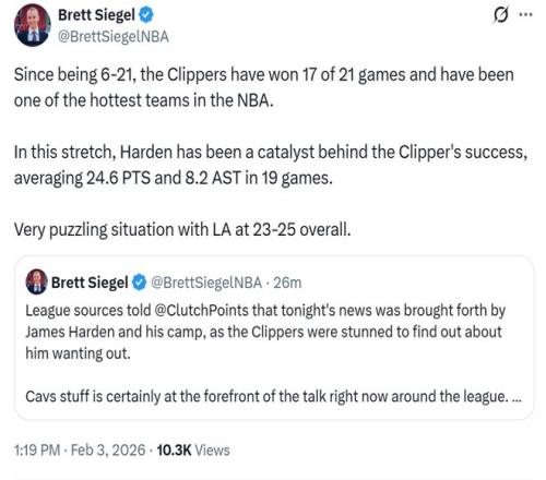 名记Siegel随后发文确认是哈登与其团队向球队管理层提出交易申请,快船队对此感到很震惊,但还是同意了。